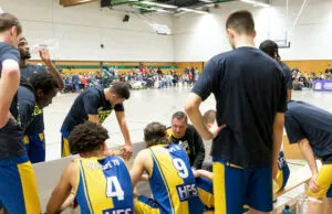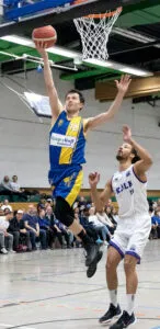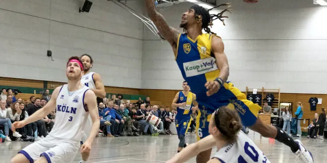 Ein dickes Ausrufezeichen setzten die Blau-Gelben bei ihrer Playoffpremiere in Deutz bei den dort beheimateten Kellerkindern. Beide Teams zeigten von Beginn an viele gute offensive Aktionen und es entwickelte sich zumindest für die Zuschauer eine interessante Partie. Im ersten Spielabschnitt gelang den Gästen, die lautstark von ihren Fans angefeuert wurden, wenig in der Defense. Folgerichtig war der 9-Punkte-Rückstand nach den ersten 10 Minuten. Als es im 2ten Viertel nicht besser wurde, justierten die Gäste nach und intensivierten ihre Anstrengungen in der Defense. Das in Kombination mit einer besserer Trefferquote brachte die 70ger immer näher heran.