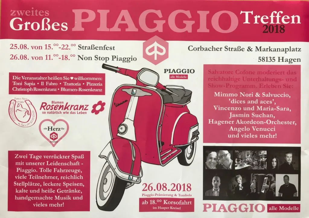 Zum zweiten Mal nach 2017 findet das “Große Piaggio Treffen” in der Corbacherstraße & Markanaplatz am 25. + 26.August 2018 in Haspe statt. Die Veranstalter sind Toni Sapia (Trattoria/Pizzeria Il Fabbro – Businesspartner des SV Haspe 70) und Christoph Rosenkranz (Blumen Rosenkranz).
