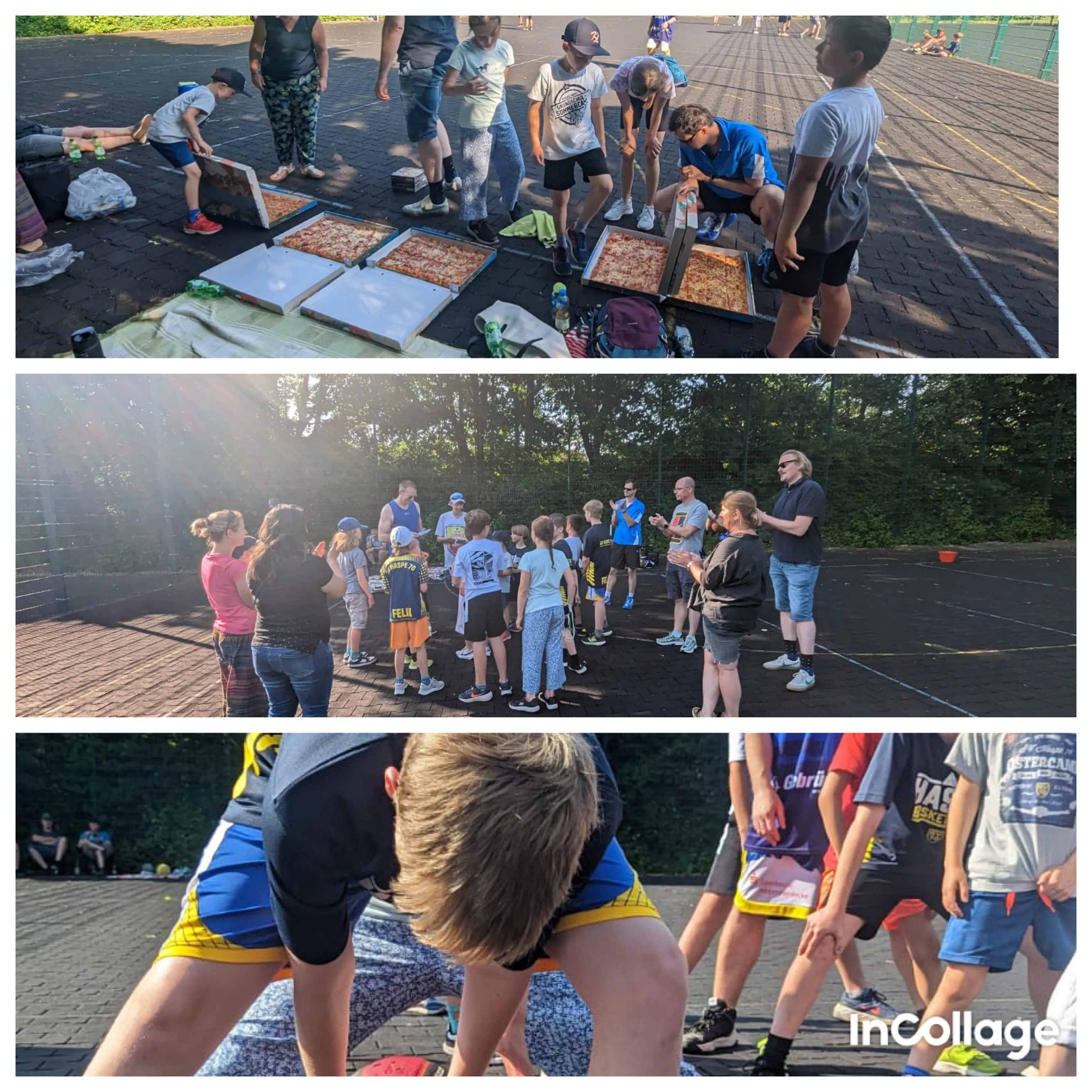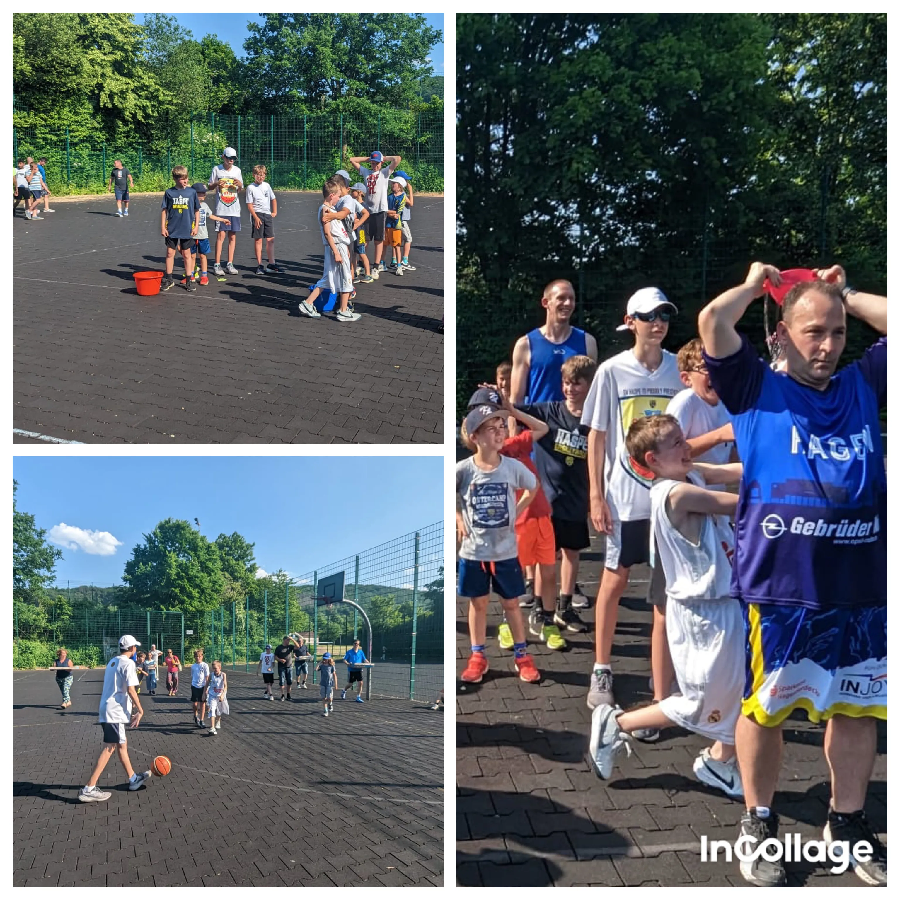 Bei bestem Wetter trafen sich noch einmal alle U10-1er der vergangenen Saison und deren Eltern in der Bezirkssportanlage Haspe, um gemeinsam die vergangene Saison zu feiern und abzuschließen. Startschuss war um 16 Uhr und sofort wurden erst einmal ein paar Körbe geworfen; zum Warmwerden, wem noch nicht warm genug war. Im Anschluss gab es eine nötige Abkühlung. Feucht, fröhliche (Wasser)Spiele endeten in der ein oder anderen Wasserschlacht – Ergebnis nebensächlich, Hauptsache alle waren abgekühlt. Die Pizza, die um 18 Uhr geliefert wurde, musste sich noch ein wenig verdient werden – also wurde wieder gezockt mit Spielern, Coaches, Eltern & Geschwistern.