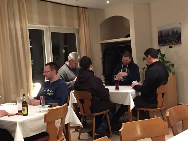 Am diesjährigen traditionellen Skatturnier nahmen 13 Spieler teil. Trotz frostiger Temperaturen herrschte gute Stimmung, insbesondere dann, als in Runde 4 an Tisch 1 (Arno, Jörg, K.-Heinz) beim Spiel 6 die Entscheidung fiel. “Arno unersättlich” spielte anstatt eines sicheren Farbenspiels mit “Vieren” den hochwertigeren Grand. Da schlug die Stunde von Jörg und K.-Heinz. Vier sichere Stiche, und anstatt 100 Pluspunkte wurden 200 Minuspunkte verbucht. Das Jammern war groß und hielt bis zur Siegerehrung an. Geduldig ertrug Jörg die Kunde, am Ende den “undankbaren 3.Platz” (Die Siegprämie reichte trotzdem für die obligatorische Runde!) belegt zu haben.