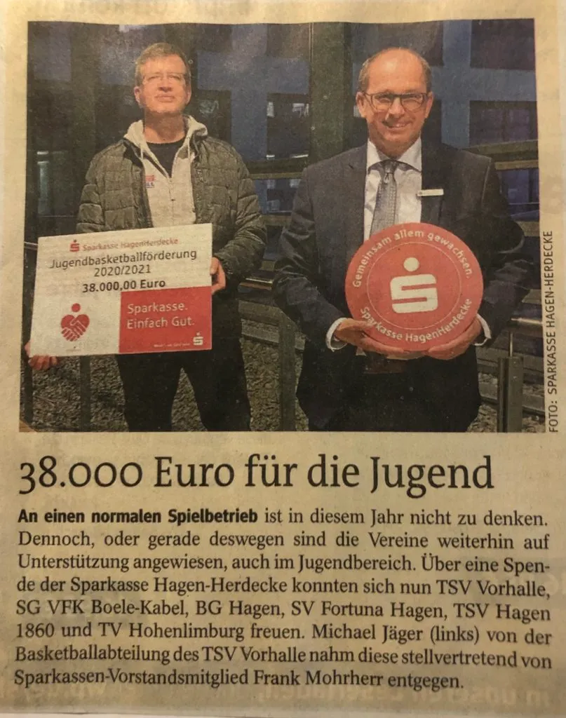 Auch in diesem Jahr setzt die Sparkasse HagenHerdecke ihre Förderung für den Jugendbasketball in Hagen mit einem Betrag in Höhe von 38000 Euro fort. Michael Jäger, TSV Vorhalle, nahm stellvertretend für die Hagener Vereine symbolisch den Scheck vom Sparkassen Vorstandsmitglied Frank Mohrherr entgegen.
