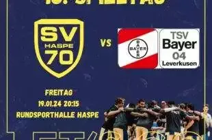 DIe 1. Mannschaft des SV Haspe 70 hat einen wichtigen Sieg “eingefahren”. Gegen das Team des TSV Bayer 04 Leverkusen gelang am Freitagabend der Heimsieg und der 7. Saisonsieg. Freitag, 19.01.2024 | 20:15 …