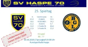 SV Haspe 70 – Sterkrade 69ers 83:76 (43:25) Zwei verschiedene Halbzeiten zeigte die u18 des SV Haspe 70 bei ihrem Erfolg gegen den Tabellenzweiten. Denn zunächst spielten die Gastgeber relativ geduldig und souverän …